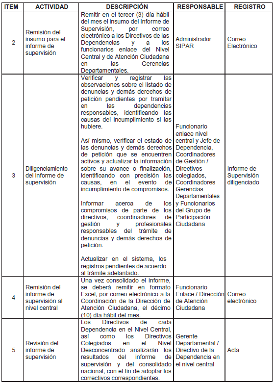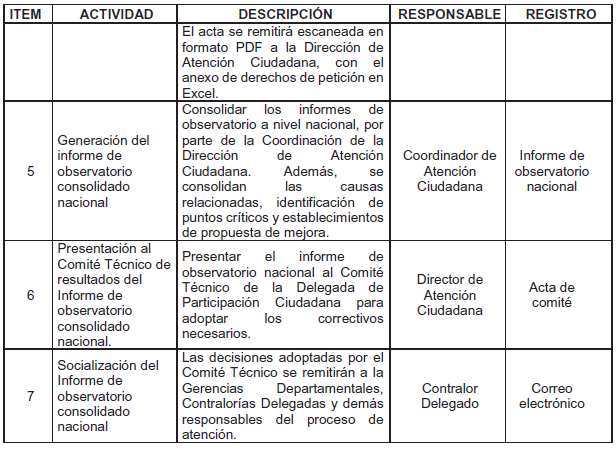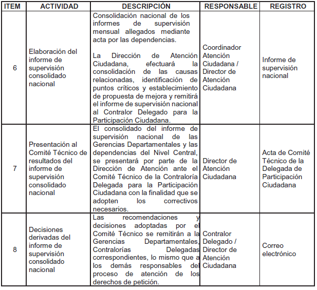 Como resultado de la supervisión, la Dirección de Atención Ciudadana, conjuntamente con las gerencias departamentales, las contralorías delegadas sectoriales y demás dependencias responsables del trámite de los derechos de petición, emitirá un informe mensual que se presentará en el Comité Técnico de la Contraloría Delegada para la Participación Ciudadana, instancia que valorará y decidirá las acciones que se adopten sobre el particular.