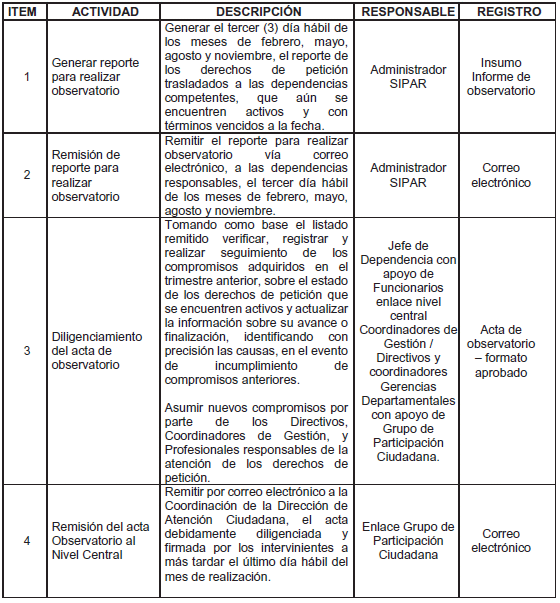 El Observatorio es una herramienta de control que realiza cada dependencia en particular y la Contraloría Delegada para la Participación Ciudadana en general, a fin de revisar el estado de trámite de los derechos de petición que se reportan activos en cada dependencia y proceder a realizar compromiso de actuaciones para evitar el vencimiento de los términos de los derechos de petición.