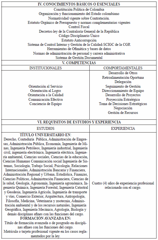 NOTAS DE VIGENCIA: - Resolución derogada por el artículo 6 de la Resolución OGZ-0739 de 2020, 'por la cual se establece el Manual Específico de Funciones, Requisitos y Competencias Laborales de los empleos de la planta de personal de la Contraloría General de la República', publicada en el Diario Oficial No. 51.219 de 6 de febrero 2020. |