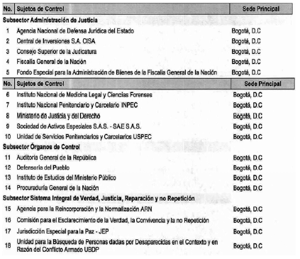 ARTÍCULO 10. CONTRALORÍA DELEGADA PARA EL SECTOR JUSTICIA. <Resolución derogada por el artículo 30 de la Resolución REG-EJE-0073 de 2020> La Contraloría Delegada para el Sector Justicia, será competente para ejercer la vigilancia y el control fiscal a los siguientes sujetos de control: