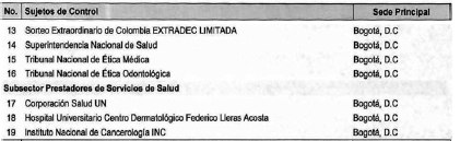 ARTÍCULO 13. CONTRALORÍA DELEGADA PARA EL SECTOR SALUD. <Resolución derogada por el artículo 30 de la Resolución REG-EJE-0073 de 2020> La Contraloría Delegada para el Sector Salud será competente para ejercer la vigilancia y el control fiscal a los siguientes sujetos de control: