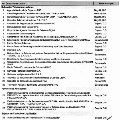 ARTÍCULO 4o. CONTRALORÍA PARA EL SECTOR DE TECNOLOGÍAS DE LA INFORMACIÓN Y LAS COMUNICACIONES. <Resolución derogada por el artículo 30 de la Resolución REG-EJE-0073 de 2020> La Contraloría Delegada para el Sector de Tecnologías de la Información y las Comunicaciones será competente para ejercer la vigilancia y el control fiscal a los siguientes sujetos de control: