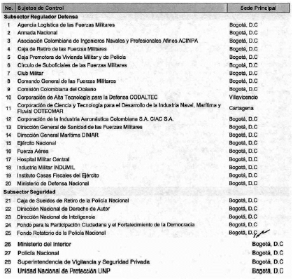 ARTÍCULO 5o. CONTRALORÍA PARA EL SECTOR DEFENSA Y SEGURIDAD. <Resolución derogada por el artículo 30 de la Resolución REG-EJE-0073 de 2020> La Contraloría Delegada para el Sector Defensa y Seguridad será competente para ejercer la vigilancia y el control fiscal a los siguientes sujetos de control: