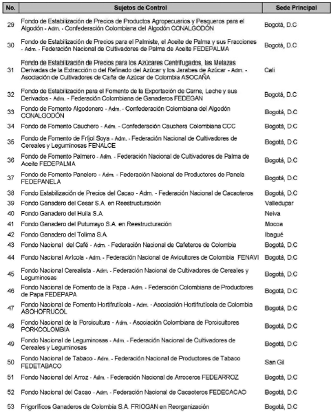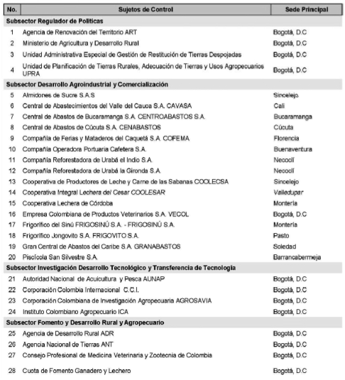 ARTÍCULO 2o. CONTRALORÍA DELEGADA PARA EL SECTOR AGROPECUARIO. <Resolución derogada por el artículo 31 de la Resolución 62 de 2020> La Contraloría Delegada para el Sector Agropecuario, será competente para ejercer vigilancia y control fiscal a los siguientes sujetos de control: