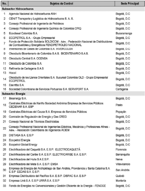 ARTÍCULO 8o. CONTRALORÍA DELEGADA PARA EL SECTOR MINAS Y ENERGÍA. <Resolución derogada por el artículo 31 de la Resolución 62 de 2020> La Contraloría Delegada para el Sector Minas y Energía será competente para ejercer la vigilancia y el control fiscal a los siguientes sujetos de control: