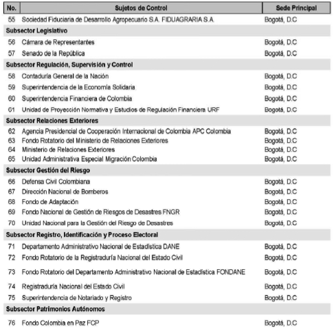 Que la Ley 42 de 1993 en el artículo 2o, determina los sujetos de control fiscal de la Contraloría General de la República, indicando: “(…)los órganos que integran las ramas legislativa y judicial; los órganos autónomos e independientes como los de control y electorales; los organismos que hacen parte de la estructura de la administración nacional y demás entidades nacionales, los organismos creados por la Constitución Nacional y la ley que tienen régimen especial, las sociedades de economía mixta; las empresas industriales y comerciales del Estado, los particulares que manejen fondos o bienes del Estado, las personas jurídicas y cualquier otro tipo de organización o sociedad que maneje recursos del Estado en lo relacionado con estos y el Banco de la República”;