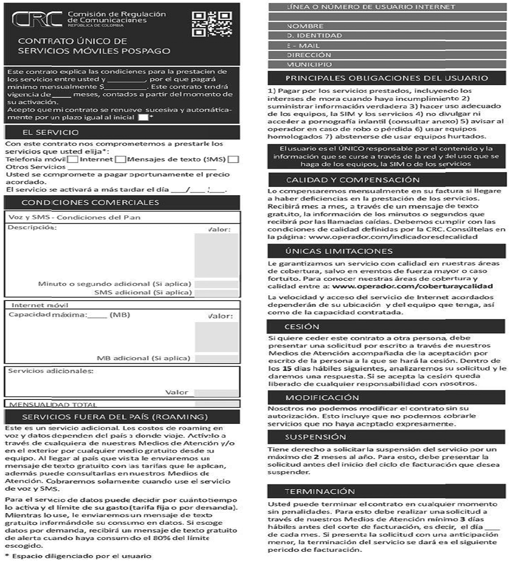 “CONTRATO DE PRESTACIÓN DE SERVICIOS DE COMUNICACIONES: Acuerdo de voluntades entre el usuario, y el proveedor de servicios de comunicaciones u operador del servicio de televisión por suscripción, el cual deberá constar en copia escrita física o electrónica, para el suministro de los servicios de telefonía, internet y/o televisión por suscripción, del cual se derivan derechos y obligaciones para las partes.