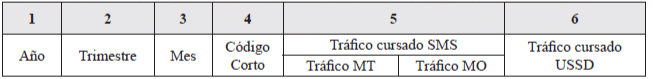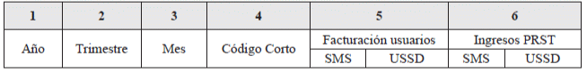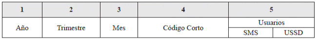 5. Usuarios: Corresponde al número de usuarios únicos por código corto, durante el mes de reporte, que hacen uso de mensajes cortos de texto (SMS) y mensajes a través de Servicio Suplementario de Datos no Estructurados (USSD) para el acceso a contenidos y aplicaciones”.