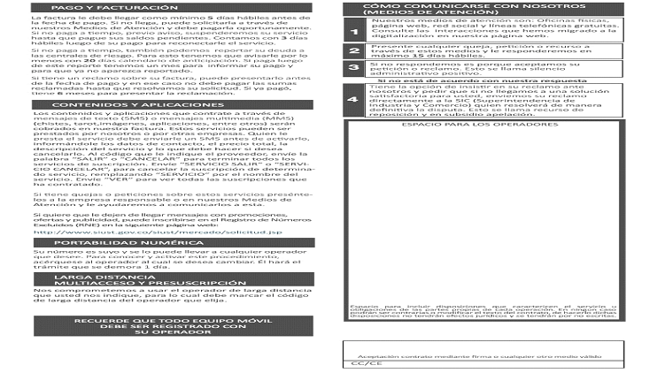 - FORMATO 4.3 Y FORMATO 4.4. del Anexo 1 de la Resolución CRC 5076 de 2016. “FORMATOS DE LOS CONTRATOS ÚNICOS DE PRESTACIÓN DE SERVICIOS DE COMUNICACIONES.”