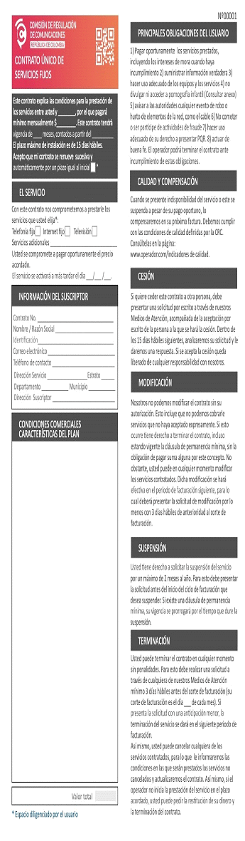 - ANEXO 2.3 del Título “Anexos Título II” de la Resolución CRC 5050 de 2016: “FORMATOS DE LOS CONTRATOS ÚNICOS DE PRESTACIÓN DE SERVICIOS DE COMUNICACIONES”