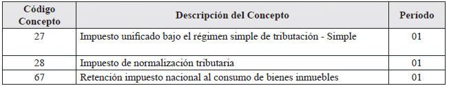 ARTÍCULO 3o. Adicionar al instructivo del formulario 490 “Recibo Oficial de Pago Impuestos Nacionales”, prescrito mediante Resolución 0004 del 15 de enero de 2019, los siguientes conceptos de pago: