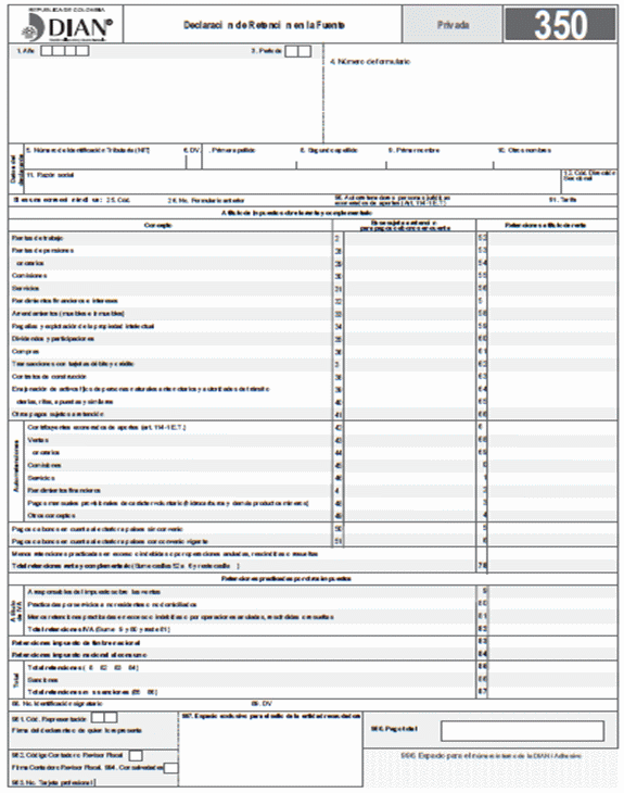 ARTÍCULO 2o. DECLARACIÓN DE RETENCIÓN EN LA FUENTE - FORMULARIO NÚMERO 350. <Formulario subrogado por el artículo 1 de la Resolución 55 de 2019> Prescribir para la presentación de la “Declaración de Retención en la Fuente” del año gravable 2019, el Formulario Modelo número 350, diseño que forma parte integral de la presente resolución.