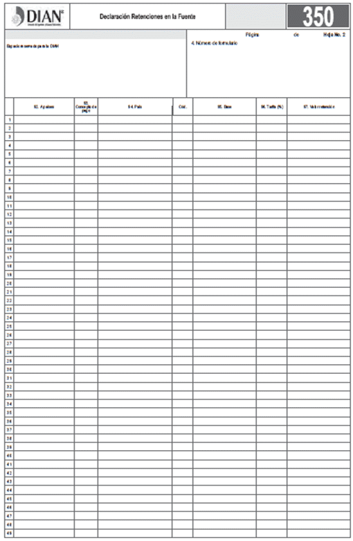 PARÁGRAFO 2o. Los agentes retenedores que hagan pagos o abonos en cuenta por concepto de rentas sujetas a impuesto en Colombia, a favor de sociedades u otras entidades extranjeras sin domicilio en Colombia, personas naturales extranjeras sin residencia en Colombia o sucesiones ilíquidas de extranjeros que no eran residentes en Colombia, deberán presentar el Formulario número 350 a través de medios electrónicos diligenciando los datos anexos de la sección “Retención a título de renta practicadas por pagos o abonos en cuenta al exterior” que se verán reflejados en la hoja 2 la cual hace parte integral de este formulario.
