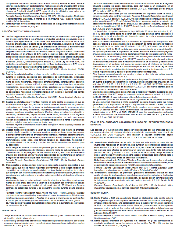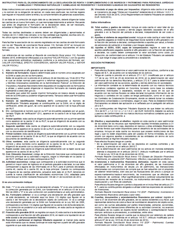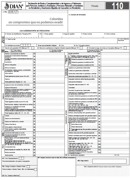 ARTÍCULO 1o. DECLARACIÓN DE RENTA Y COMPLEMENTARIO O DE INGRESOS Y PATRIMONIO PARA PERSONAS JURÍDICAS Y ASIMILADAS Y PERSONAS NATURALES Y ASIMILADAS NO RESIDENTES Y SUCESIONES ILÍQUIDAS DE CAUSANTES NO RESIDENTES, - FORMULARIO NÚMERO 110. Prescribir para la presentación de la “Declaración de Renta y Complementario o de Ingresos y Patrimonio para Personas Jurídicas y Asimiladas y Personas Naturales y Asimiladas no Residentes y Sucesiones Ilíquidas de Causantes no Residentes” correspondiente al año gravable 2017 o fracción de año gravable 2018, el Formulario Modelo número 110, diseño que forma parte integral de la presente resolución.