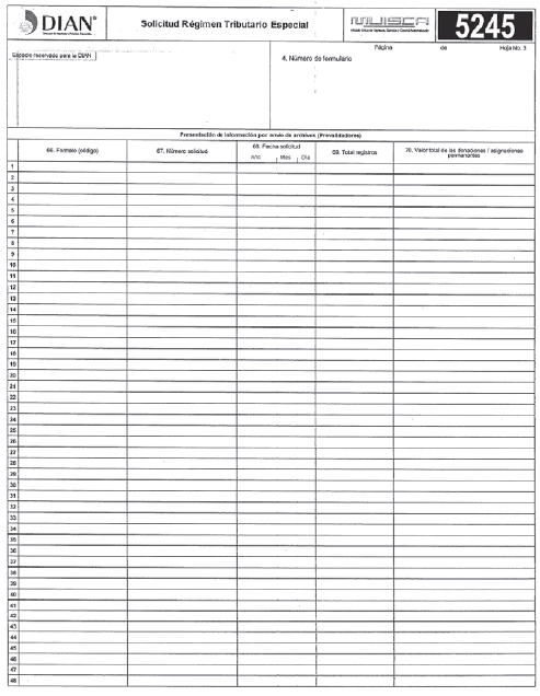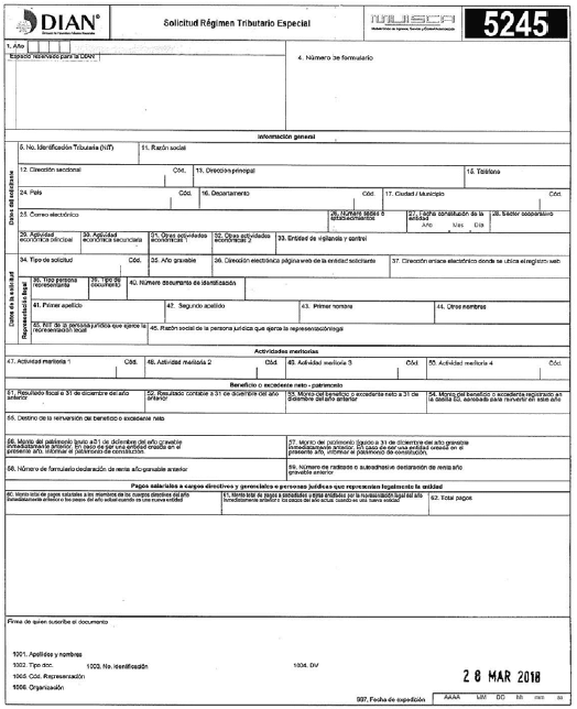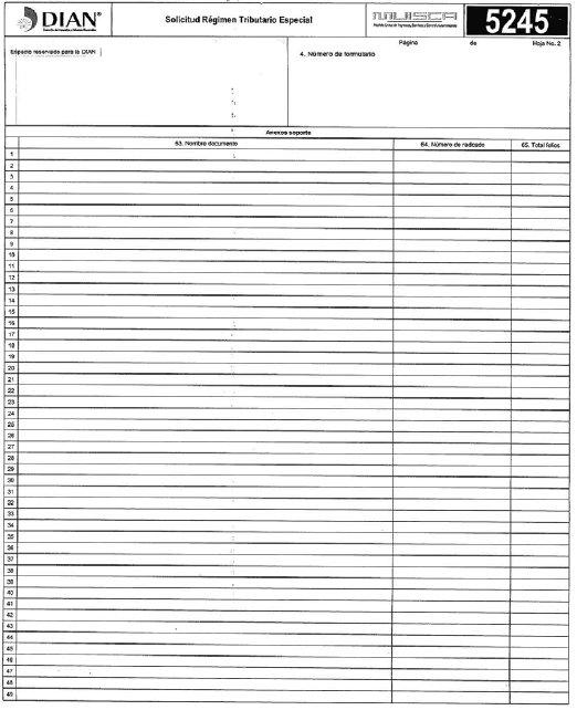 ARTÍCULO 2o. FORMULARIO PARA PRESENTAR SOLICITUD. <Artículo compilado como artículo 1.1.6.2 en la Resolución 227 de 2025> Prescribir el Formato “Solicitud Régimen Tributario Especial” Código 5245, para que las Entidades sin Ánimo de Lucro establecidas en el artículo 19 y 19-4 del Estatuto Tributario interesadas en realizar los procesos de Calificación, Readmisión, Permanencia y Actualización de manera virtual e incluyan la información requerida por la ley, adjuntando los documentos soportes, formato que hace parte integral de la presente resolución. Anexo número 1.