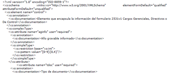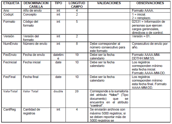 El formato 2531 - Información de personas que ejercen cargos gerenciales, directivos o de control, es un archivo XML, que está compuesto por dos documentos complejos: Encabezado y Contenido, lo cuales se deben enviar en el orden enunciado a continuación:
