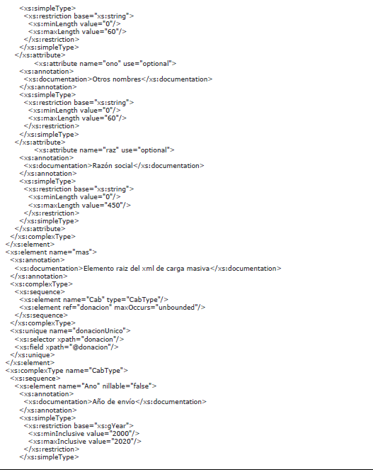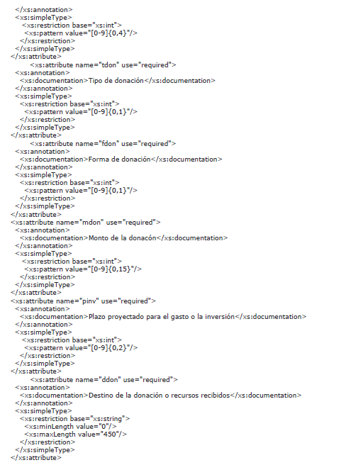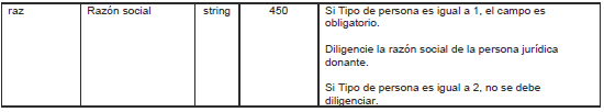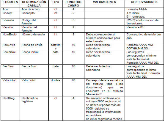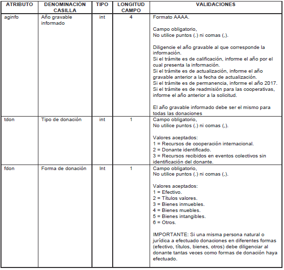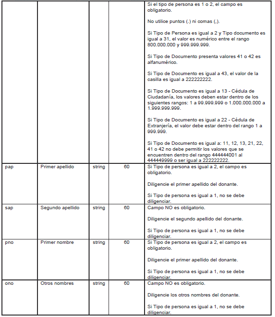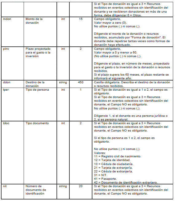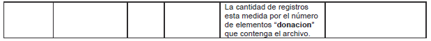 En el contenido del archivo viene el elemento “donación” y se debe Incluir la siguiente Información para cada registro de donación.