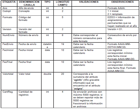 El formato 2533 - Información de asignaciones permanentes que se hayan realizado en el año, es un archivo XML, que está compuesto por dos documentos complejos: Encabezado y Contenido, lo cuales se deben enviar en el orden enunciado a continuación:
