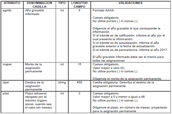 Definir las características y contenido del archivo donde se reporta la información de las asignaciones permanentes que trata el numeral 4 del parágrafo 2, del artículo 364-5 del Estatuto Tributario, para la presentación de las solicitudes de calificación, permanencia y readmisión o actualización del registro web (Formulario 5245) de las Entidades Sin Ánimo de Lucro que deseen permanecer o pertenecer al Régimen Tributario Especial del Impuesto sobre la renta y Complementario.