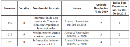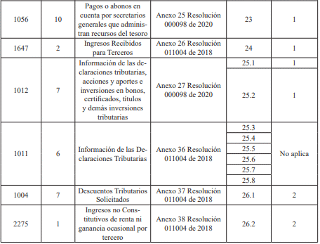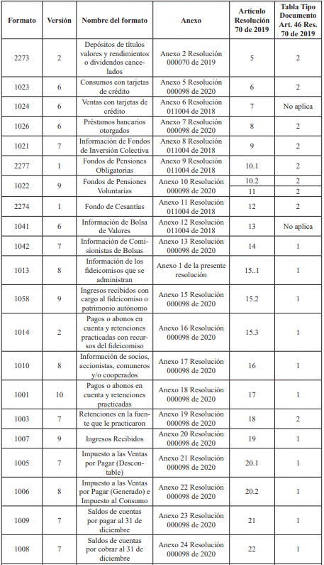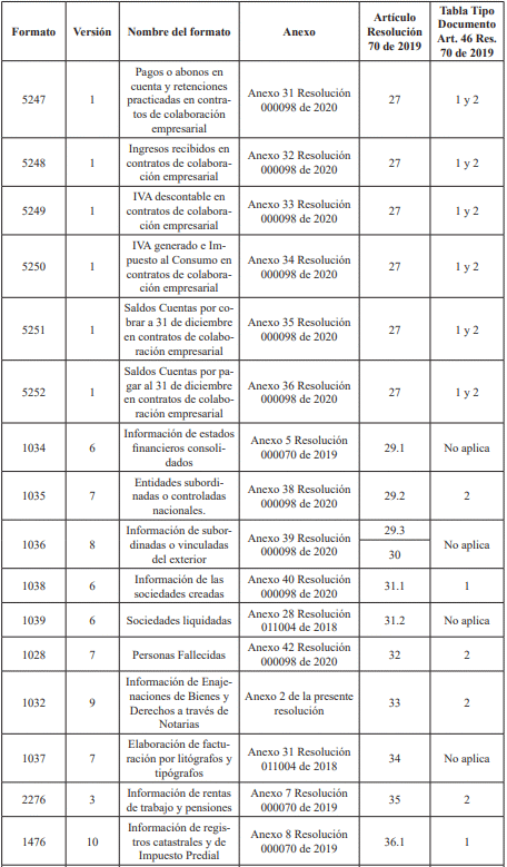 Que se hace necesario modificar la tabla de los anexos técnicos del artículo 46 de la Resolución 000070 del 28 de octubre de 2019, con la finalidad de actualizar los anexos correspondientes a los mismos esquemas XSD de las especificaciones técnicas de los formatos que ya fueron publicados con la Resolución 000098 del 28 de octubre de 2020, junto con los nuevos ajustes de los Formatos 1013 y 1032 anexos a la presente resolución. Lo anterior con el fin de facilitar la presentación de la información por parte de los obligados, mejorando las validaciones de las casillas de número de identificación;