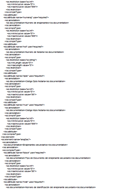 | ValorTotal | Valor Total | double | 20 | Correspondiente a la sumatoria de la casilla "esc" (Número de escritura) que se encuentra en el atributo enajenaciones". | - |