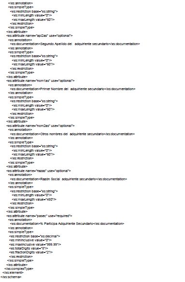 | nom2as | Otros nombres del adquiriente secundario | string | 60 | En caso de ser una Persona Natural y si se conoce debe diligenciarse. |