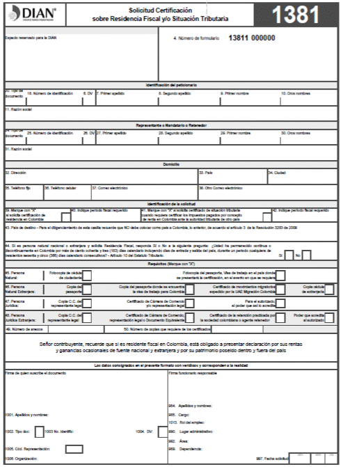 ARTÍCULO 7o. FORMATOS. Las solicitudes de Certificación de Acreditación de Residencia Fiscal o sobre Situación Tributaria a que se refiere la presente resolución, deberán realizarse diligenciando en su totalidad la información solicitada en el formato número 1381 adjunto, el cual hace parte integral de esta resolución.