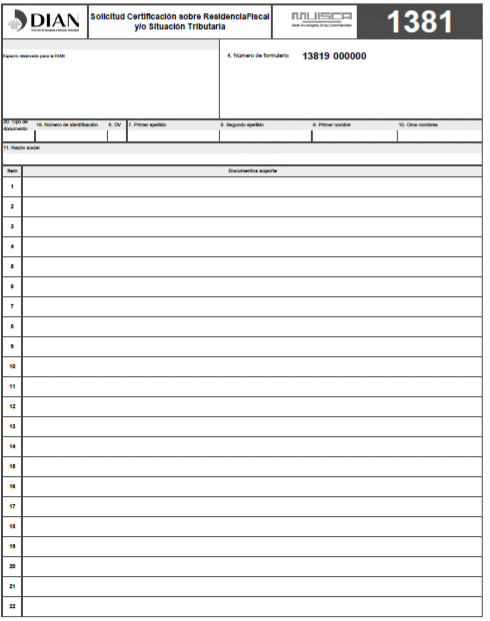 ARTÍCULO 3o. REQUISITOS PARA LA PRESENTACIÓN DE LA SOLICITUD DE CERTIFICADOS DE ACREDITACIÓN DE RESIDENCIA FISCAL Y/O SITUACIÓN TRIBUTARIA. La presentación de la solicitud deberá hacerse con el diligenciamiento del formato número 1381, firmado por el peticionario o apoderado y deberá acompañarse de los siguientes documentos, según corresponda: