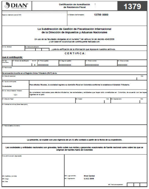 La Certificación de Acreditación de Residencia Fiscal en Colombia, deberá expedirse en el formato número 1379 adjunto, el cual hace parte integral de esta resolución.