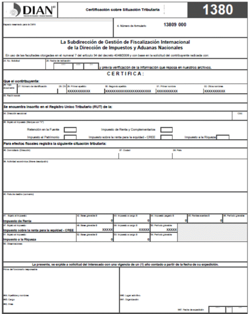 La Certificación sobre Situación Tributaria en Colombia, deberá expedirse en el formato número 1380 adjunto, el cual hace parte integral de esta resolución.