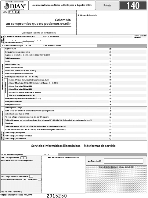 El Formulario Modelo número 140, “Declaración del Impuesto sobre la Renta para la Equidad CREE”, será de uso obligatorio para las sociedades, personas jurídicas y asimiladas contribuyentes declarantes del impuesto sobre la renta y complementarios y las sociedades y entidades extranjeras contribuyentes declarantes del impuesto sobre la renta, que sean sujetos pasivos del CREE, por sus ingresos de fuente nacional obtenidos mediante sucursales y establecimientos permanentes.
