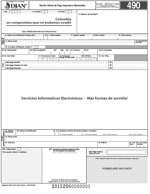 ARTÍCULO 5o. FORMULARIO NÚMERO 490. Prescribir como “Recibo Oficial de Pago Impuestos Nacionales”, el Formulario Modelo número 490, se adiciona en el instructivo de la casilla 3 el concepto “25 Impuesto a la Riqueza y su Complementario de Normalización Tributaria”, diseño que hace parte integral de la presente Resolución. El número preimpreso inicia con 2015.
