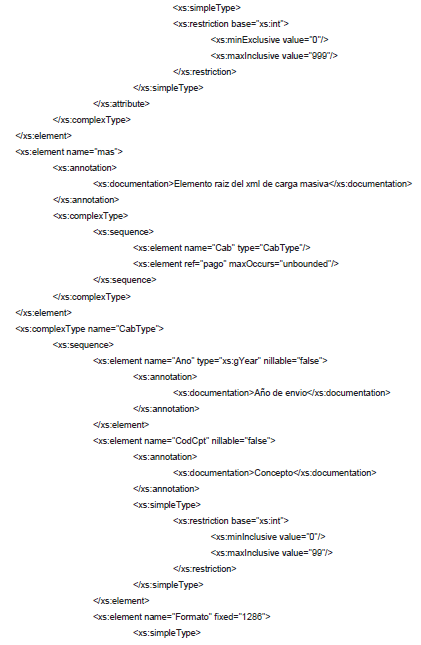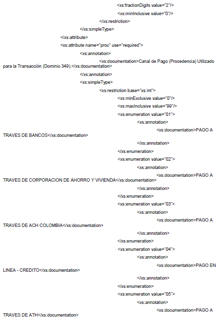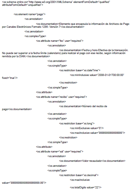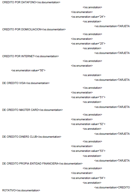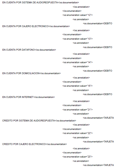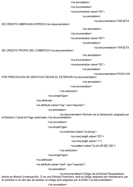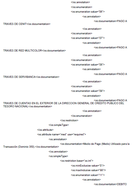 1. A continuación, se incluye el esquema XSD para esta especificación técnica. Se actualiza el esquema XSD el 9 de abril de 2019 para incluir los nuevos medios de pago.