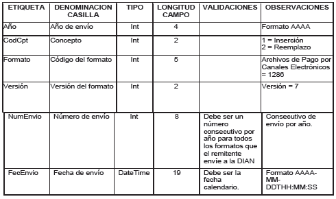 1. Los campos concepto, formato y versión, deben venir diligenciados con los valores estipulados en las especificaciones técnicas.