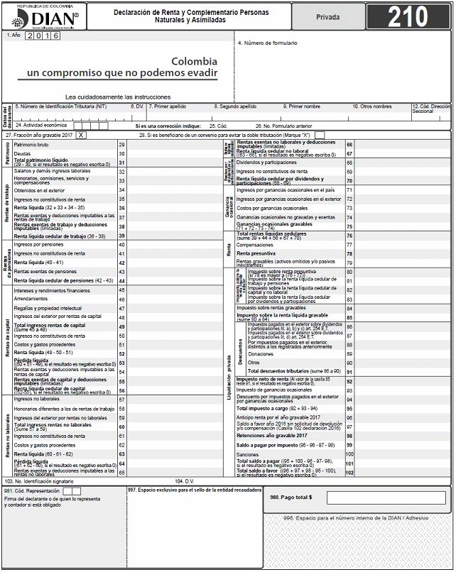 ARTÍCULO 1o. DECLARACIÓN DE RENTA Y COMPLEMENTARIO PERSONAS NATURALES Y ASIMILADAS - FRACCIÓN DE AÑO GRAVABLE 2017- FORMULARIO NO. 210. Prescribir para la presentación de la “Declaración de Renta y Complementario Personas Naturales y Asimiladas” para la declaración de la fracción de año gravable 2017, el Formulario Modelo No. 210, diseño que forma parte integral de la presente resolución.