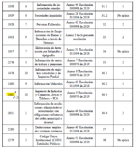 PARÁGRAFO 2o. <Parágrafo adicionado por el artículo 11 de la Resolución 23 de 2021. El nuevo texto es el siguiente:> La información de que trata el numeral 36.3 del artículo 36 de la presente resolución, correspondiente al Impuesto de Industria y Comercio, deberá ser reportada a más tardar el último día hábil del mes de agosto de 2021.