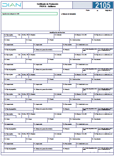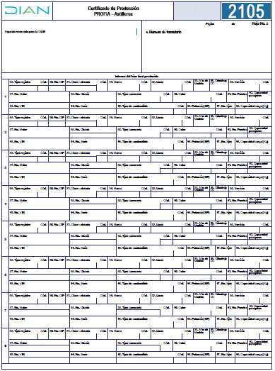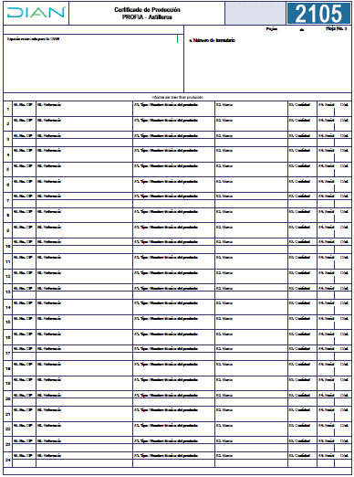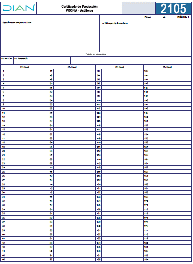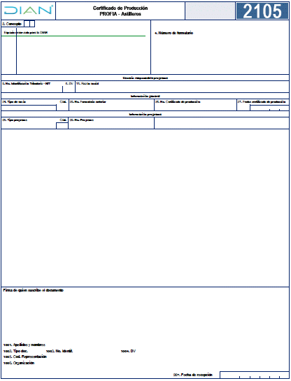 ARTÍCULO 1o. PRESCRIPCIÓN DEL FORMULARIO 2105 - CERTIFICADO DE PRODUCCIÓN PROFIA - ASTILLEROS. Prescribir como formulario oficial para la Declaración del Programa de Fomento para la Industria Automotriz y el Programa de Fomento para la Industria de Astilleros, el Formulario No. 2105 “Certificado de Producción PROFIA Astilleros”, diseño que forma parte integral de la presente resolución, de acuerdo con las disposiciones contempladas en los Decretos 1122 de 2019 y Decreto 1156 de 2020.