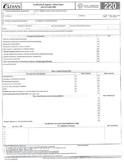 en el renglón “total retenciones año gravable 2004” del presente certificado. Por lo tanto, los asalariados no pueden ni deben presentar declaración de renta
