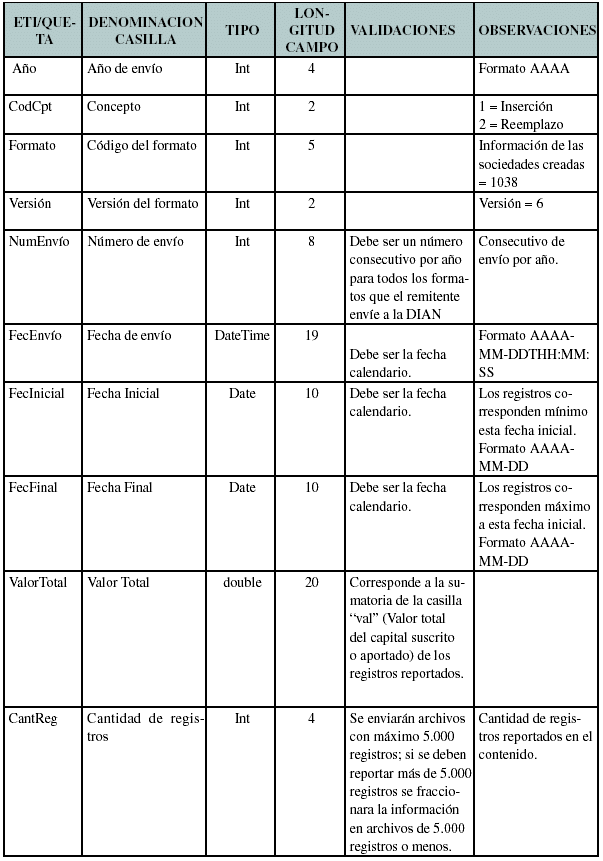 ARTÍCULO 2o. INFORMACIÓN DE LAS SOCIEDADES CREADAS. La información se debe presentar en el FORMATO 1038, Versión 6, el cual se adopta por medio de la presente resolución, indicando lo siguie nte: