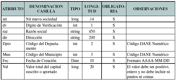 El formato de Información de las sociedades creadas, debe enviarse en un archivo XML que cumpla las siguientes especificaciones: