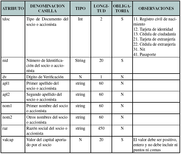 A este elemento principal se pueden agregar elementos secundarios identificados como “socios”, los cuales contienen Socios o accionistas sociedades creadas.