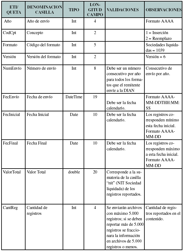 ARTÍCULO 3o. INFORMACIÓN DE LAS SOCIEDADES LIQUIDADAS. La información se debe presentar en el FORMATO 1039, Versión 6, el cual se adopta por medio de la presente resolución, indicando lo siguiente: