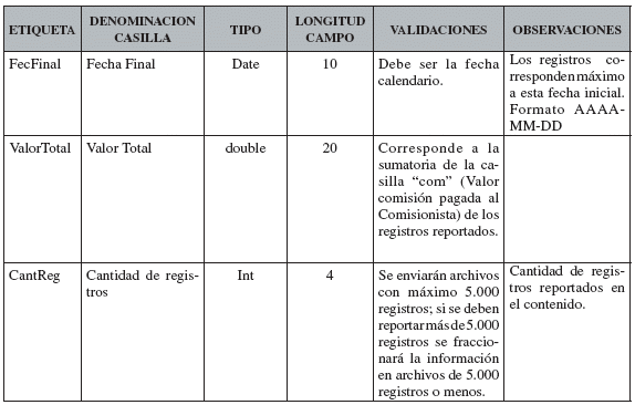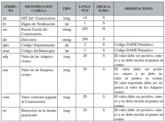 E l contenido del archivo viene en el elemento “comisionista” y se deben incluir los siguientes datos para cada transacción reportada.