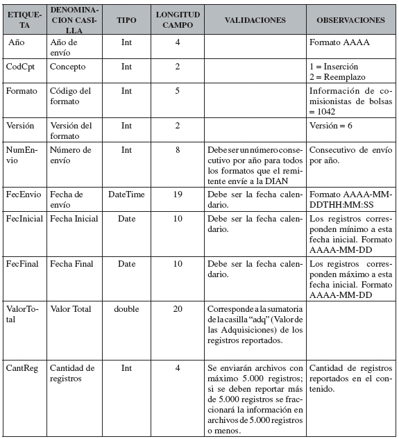 Definir las características y contenido de los archivos, donde se reporta la Información de comisionistas de bolsas.