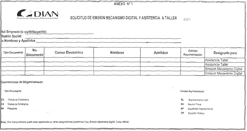 b) Señalar las personas asignadas por la empresa, representante legal o quien cumple el deber formal de presentar las declaraciones y el revisor fiscal o contador público inscritos en el Registro Unico Tributario, RUT, de la misma, para que la DIAN les emita el mecanismo de firma con certificado digital, informando en el formato Anexo número 1 de la presente resolución, los datos de la persona natural obligada o del representante legal, y del revisor fiscal o contador público (dos personas por empresa) que van a hacer uso de los Servicios Informáticos Electrónicos;
