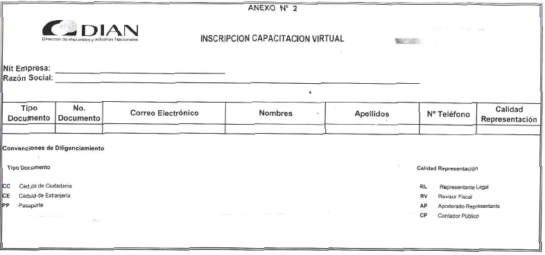 c) Inscribir una persona para que reciba la capacitación virtual sobre los servicios informáticos electrónicos de la DIAN, preferiblemente al obligado persona natural y, en el caso de las empresas, al representante legal o a quien cumple el deber formal de presentar las declaraciones, el revisor fiscal o contador público, informando los datos en el formato Anexo número 2, de la presente resolución;