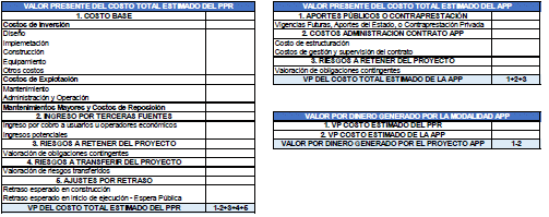 Esto implica comparar los costos netos ajustados por riesgo en el caso de una modalidad de contratación de obra pública eficiente, con los costos netos asociados a la participación de un contratista privado en la construcción, financiamiento y gestión de la infraestructura y los servicios públicos relacionados.