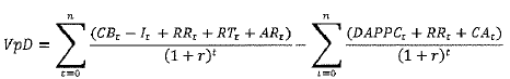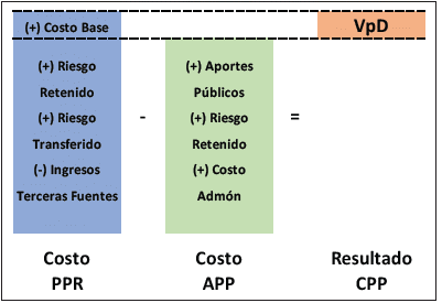 El ejercicio de VpD es eminentemente financiero, en donde los valores no están ajustados bajo el concepto de costo de oportunidad, ni se encuentran corregidos por efectos indirectos de carácter socioeconómico. En general, no se reconocen o consideran valores por concepto de beneficios sociales o de costos económicos, sino se parte del supuesto que los impactos socioeconómicos serán los mismos en ambos modelos, PPR o APP. Lo anterior considera que la infraestructura estará disponible para operación y prestación del servicio(19) en el mismo momento en ambos esquemas de contratación.
