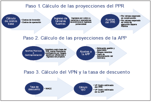 El primer paso consiste en construir el proyecto público de referencia (PPR), en el cual se simulan los costos de desarrollar el proyecto bajo el esquema de obra pública tradicional.