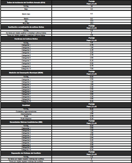 | Sustitución o erradicación de cultivos ilícitos | Puntaje Fase I, II y III |